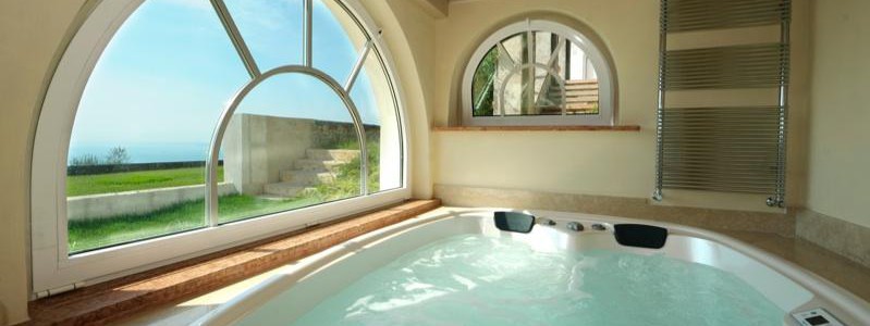 Ein privates SPA mit jedem Komfort vervollständigt den Wohnbereich. Ein großer Whirlpool, eine Sauna und ein Entspannungsbereich verwöhnen die Gäste im Wellnessbereich mit Blick auf den See.